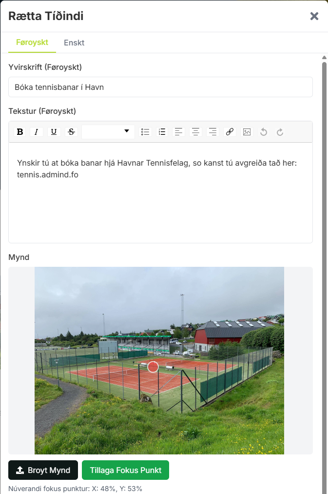 Eg havi sniðgivið nýggja búmerkið hjá Tennissamband Føroya og í tí sambandinum eisini sniðgivið og ment heimasíðuna hjá teimum. Skipanin hevur onga backend, men tú rættar beinleiðis á síðuni. Tú kanst skriva á føroyskum og enskum og velja fokuspunkt á myndum og skalera búmerkini so tey standa júst so sum tú ynskir úttrykkið at vera.
